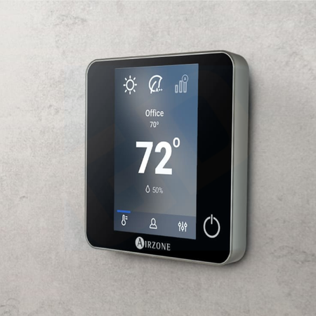 Graphic interface with low-energy e-ink screen and capacitive buttons for controlling zones in Airzone systems. Finished in steel and glass. Wireless communications. Powered by battery button CR2450.